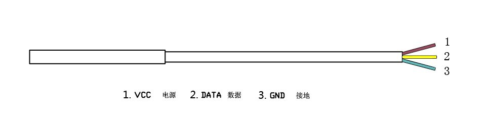 傳感器引線端由三條線組成,分別是棕色線代表電源(VCC),黃色線代表數(shù)據(jù)(DATA),藍(lán)色線代表地(GND)。